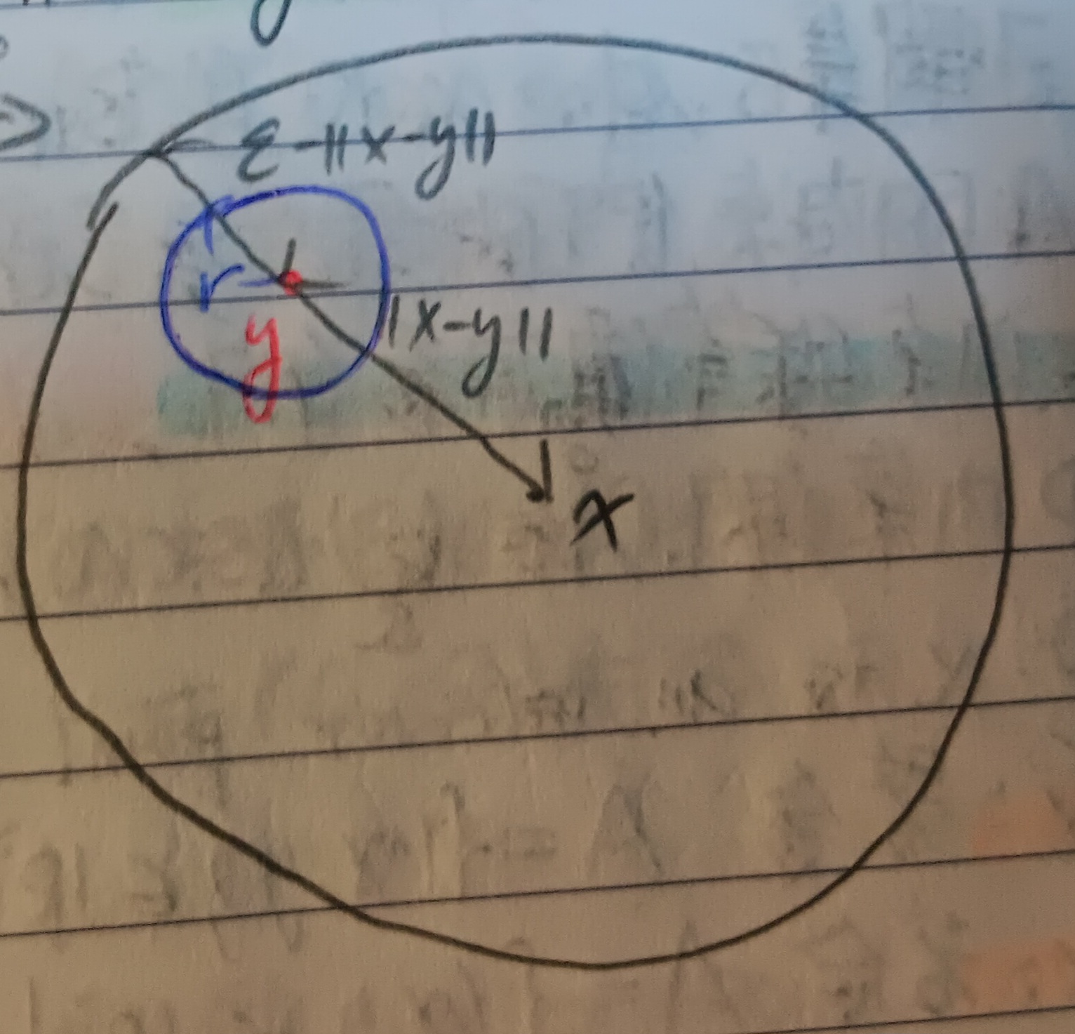 證明:對於任意\(y\in B_\epsilon(x)\),令 \[ r=\frac{1}{2}\min\{\|x-y\|,\epsilon-\|x-y\|\} \] 其中\(\|x-y\|=d(x,y)\)是給定的範數。則由下圖2可知\(B_r(y)\subseteq B_\epsilon(x)\),即\(B_\epsilon(x)\)是開集。QED