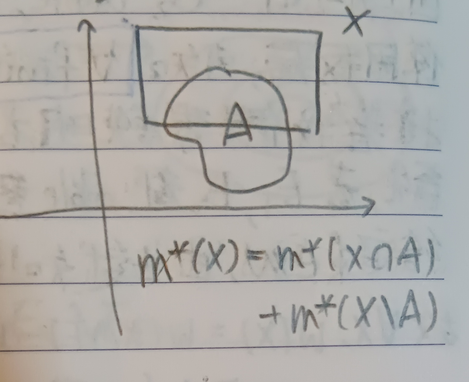 給定\(M\)上的外測度\(W\)與集合\(A\subseteq M\)。若對於所有\(X\subseteq M\)都有 \[ W(X)=W(X\cap A)+W(X\backslash A) \] 則稱\(A\)是\(W\)-可測的。